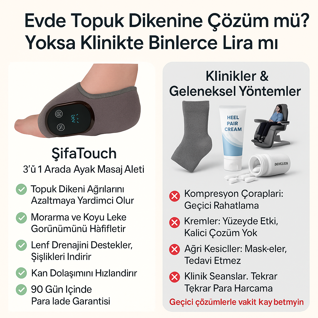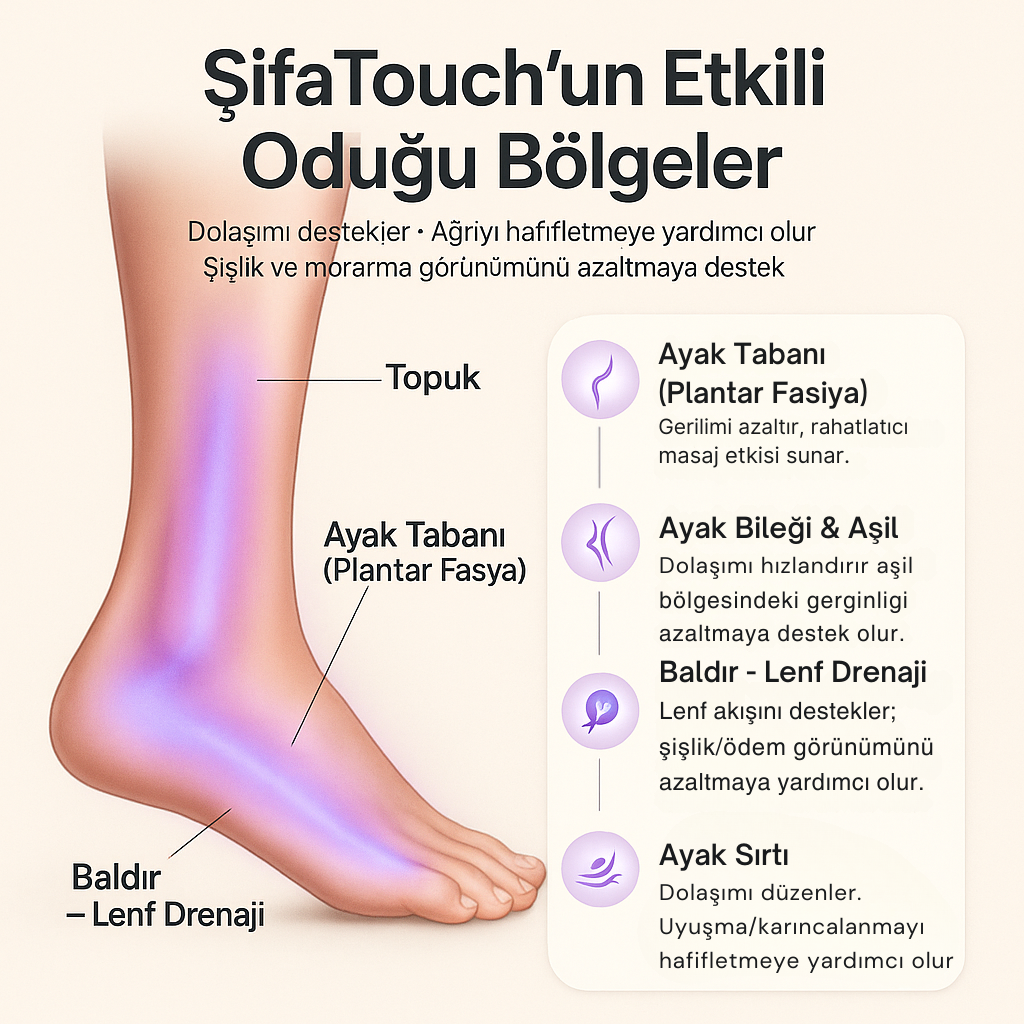 ŞifaTouch, özellikle topuk, ayak bileği ve baldır bölgesindeki ağrı, şişlik, morarma ve dolaşım sorunlarını hafifletmek için geliştirilmiş yenilikçi bir cihazdır.